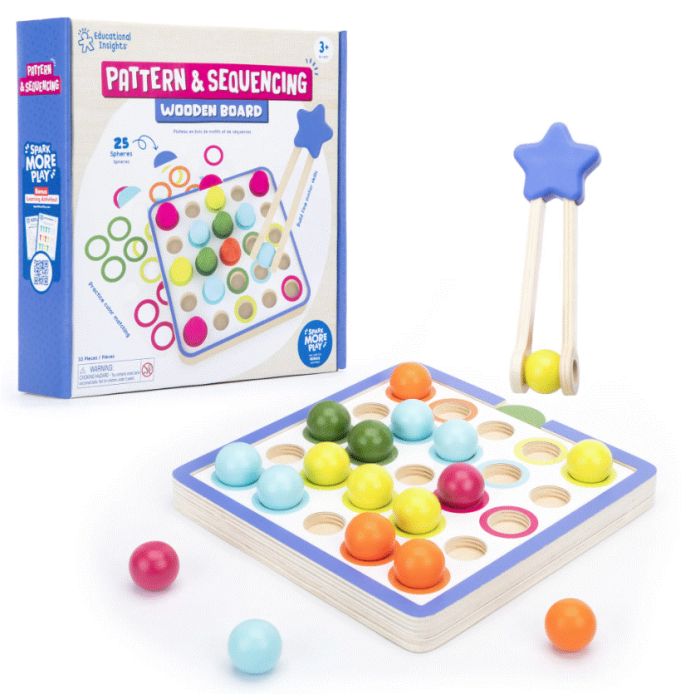 Children practise matching, patterning, sequencing and fine motor skills as they learn through play with the Pattern & Sequencing Wooden Board.