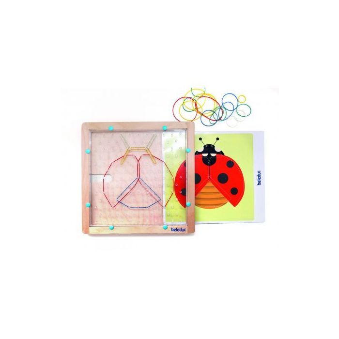 Content: 1 Wooden frame, 28 Rubber bands, 5 Template cards (printed on both sides)