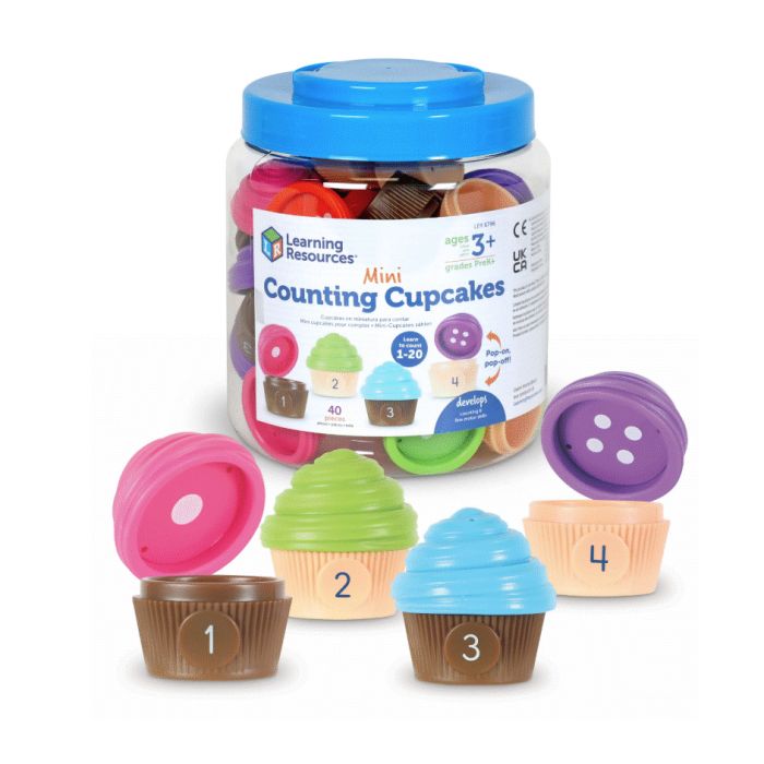 These mini cupcakes are packed with big learning fun! Kids learn how to count from 1-20 as they explore this set of 20 two-piece cupcakes—count by the number on the outside, then match with the corresponding dots printed inside each lid. Plus, learn about even and odd numbers—vanilla cupcakes are even, and chocolate cupcakes are odd! Designed for little hands, cupcakes also help kids build fine motor skills as they play. All pieces store inside the reusable bucket for easy cleanup!